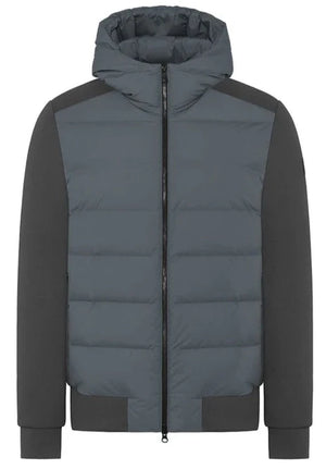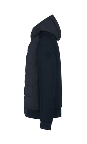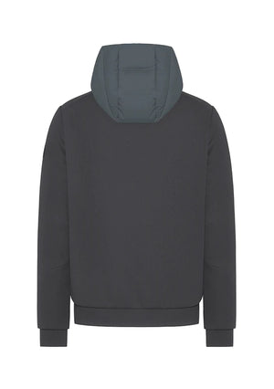 Bi-material hooded jacket in double-layered technical cotton jersey and technical bi-stretch fabric. Front closure with double-slider zipper and zippered side pockets.