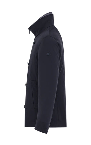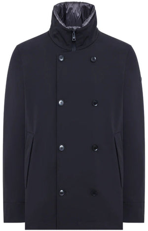 2-Layer bi-stretch fabric Peacoat with down padding, double front closure with buttons and water-resistant zipper, side windproof welt pockets and central vent at the back with hidden snap button. The garment features a detachable bib with a stand collar and a zip closure. Sleeve hem with technical knit cuffs. Multi-functional pockets with reflective details on the inside.