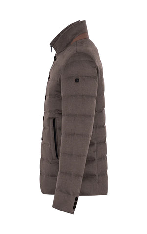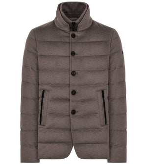 Technical wool quilted jacket with down padding featuring a detachable bib made in a superlight technical fabric with wool knit collar and zip closure. Stand collar, front closure with buttons, side welt pockets with zipper and cuff with vents and button closure. Neoprene detail with embossed logo at the back collar. Multifunctional pockets on the inside, enriched with reflective details.