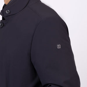 3-Layer bi-stretch fabric coat with down padding and heat-sealed seams, featuring a detachable bib with snap buttons closure. Front closure with buttons, central slit at the back with hidden snap and sleeve bottom with slit and three-button closure. Side welt pockets, contrasting coloured wool undercollar with chin strap detail with buttons and multifunctional internal pockets.